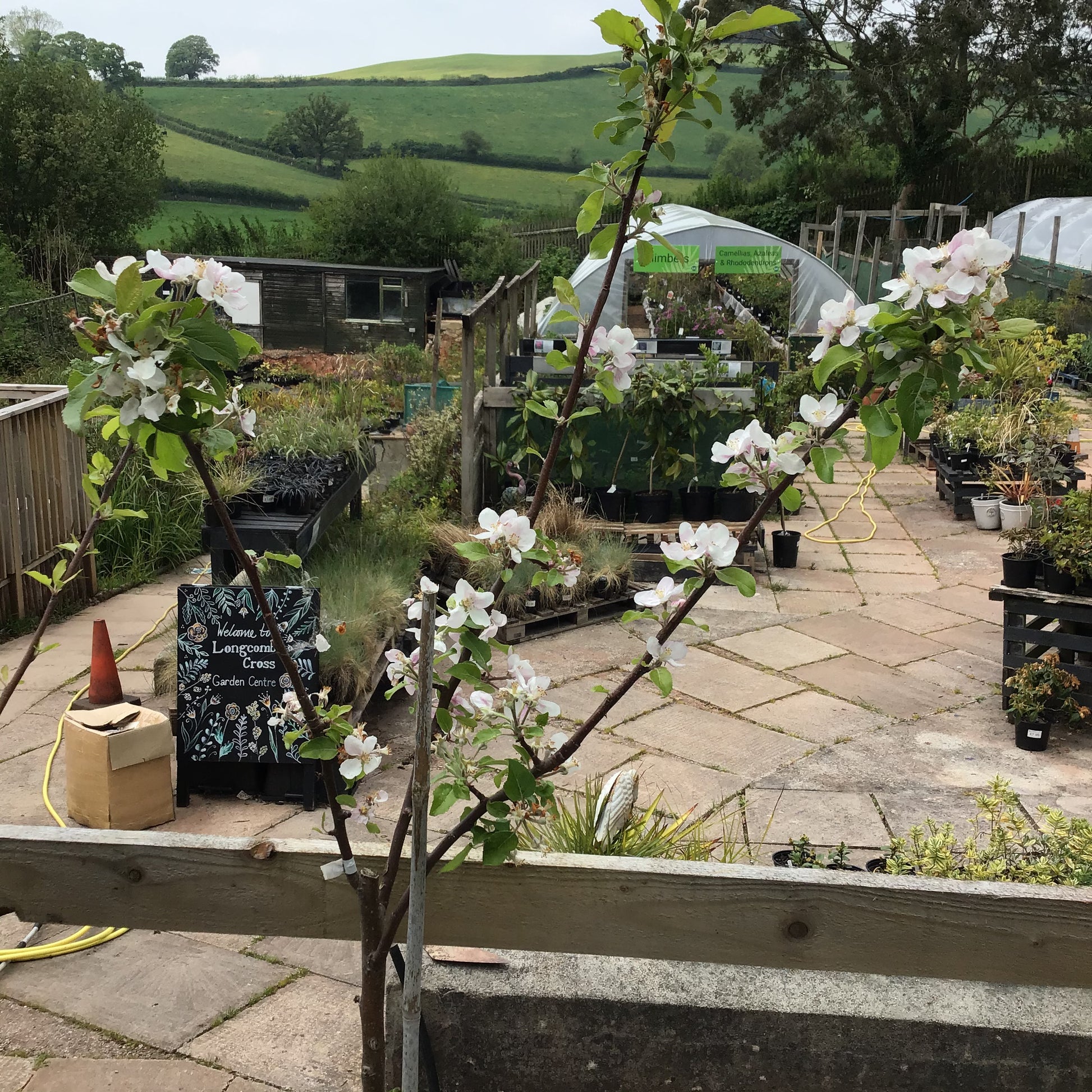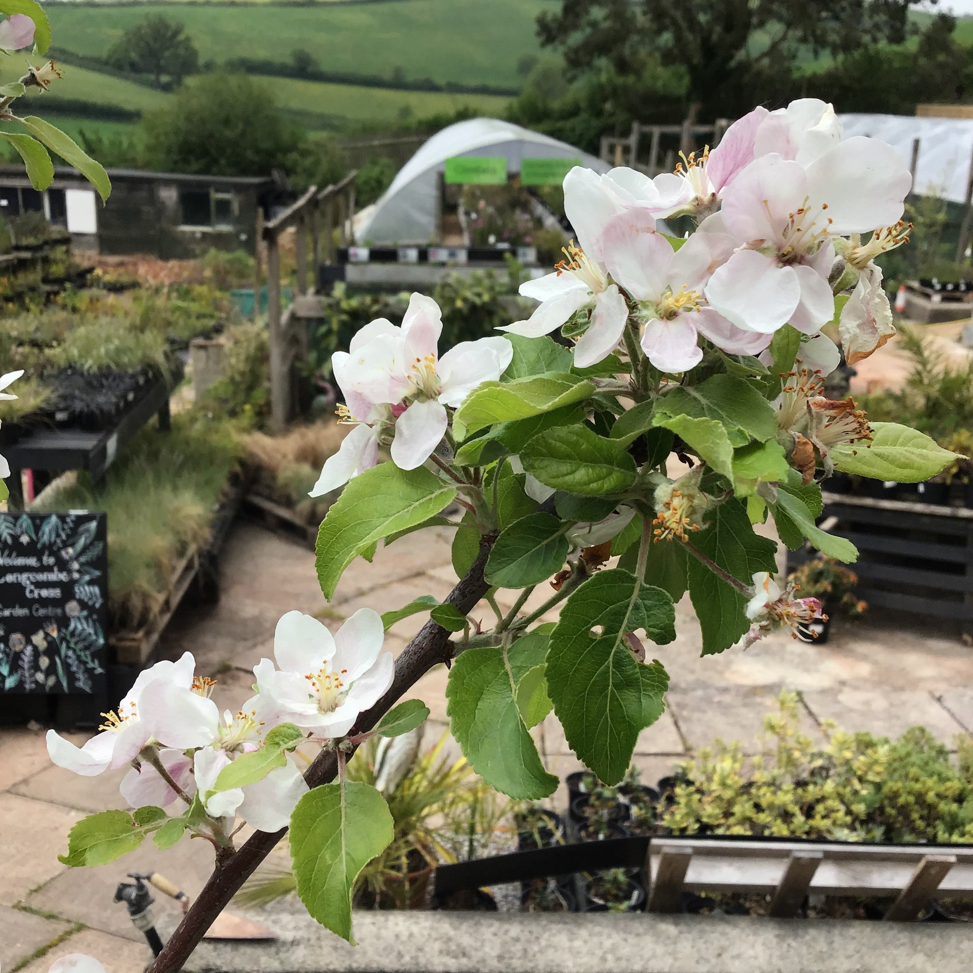 • Non-evergreen fruit tree with green leaves and pink-red blossom in Spring - apples in September