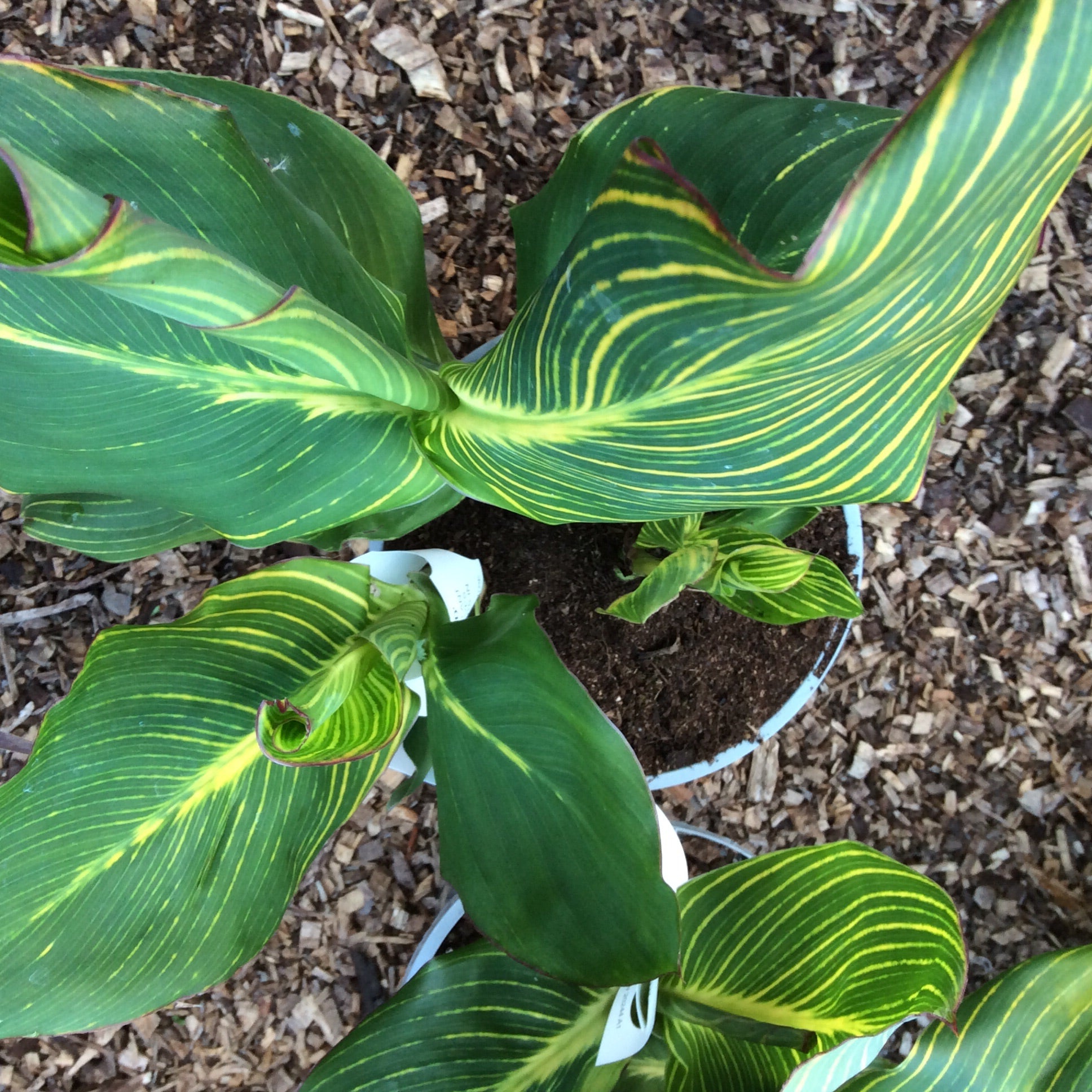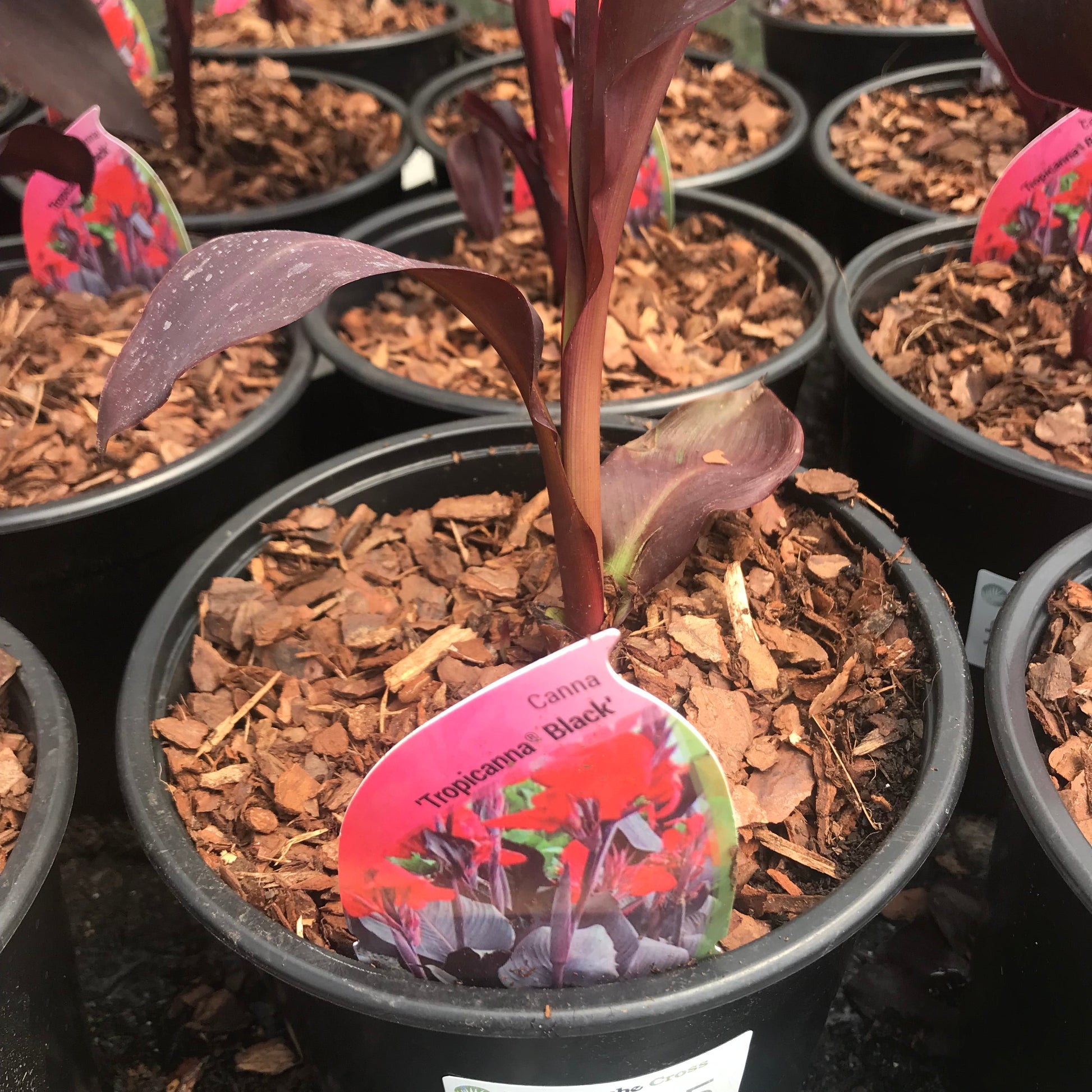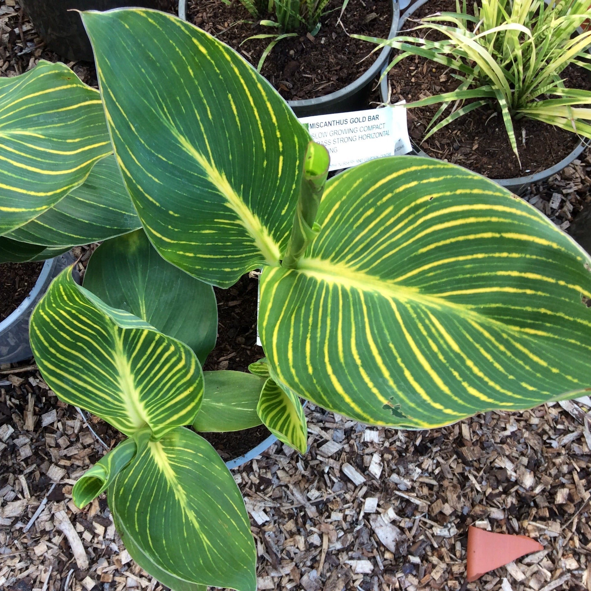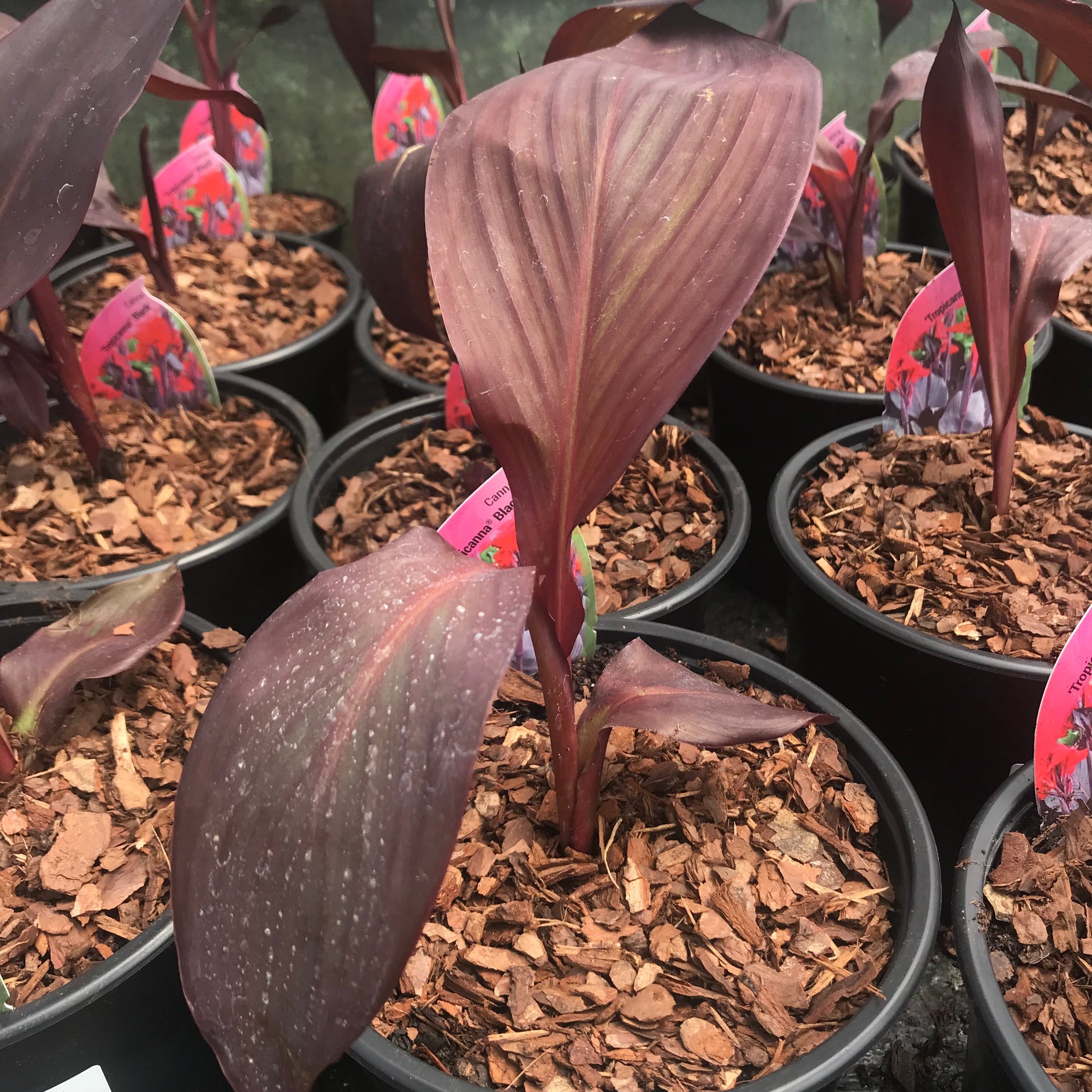 A stunning tropical canna with multi-coloured foliage of reds, oranges and yellows, orange flowers in the summer months.
